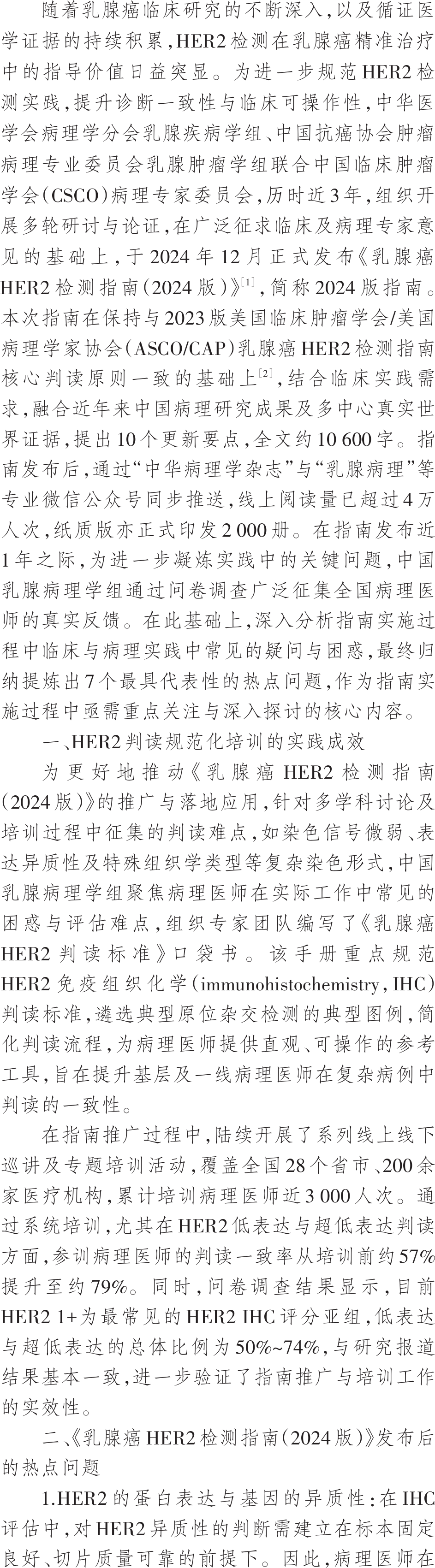 《乳腺癌HER2检测指南(2024版)》发布后,为进一步提高指南的实施效果,中国乳腺病理学组通过问卷调查广泛征集全国病理医师的反馈,分析并总结出在病理实践中7个热点问题,包括HER2蛋白表达与基因的异质性、HER2超低表达的报告、HER2低水平表达的检测与判读问题、HER2检测外对照、少见染色模式的判读标准以及新技术在HER2低水平表达检测中的作用等,反映了指南落地实施中的成效及挑战,为未来HER2检测指南的进一步优化提供了宝贵参考。