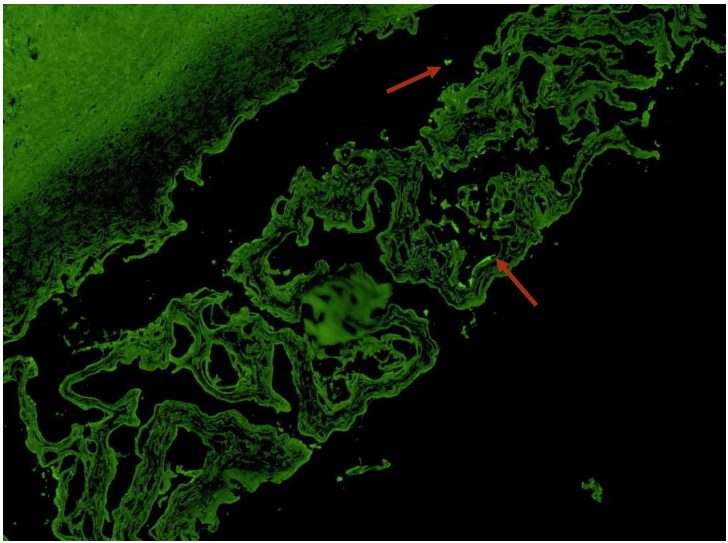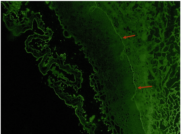 口腔黏膜活检+免疫荧光:组织病理示上皮内水疱形成;直接免疫荧光:基底膜区可见 IgG(图 2)及补体 C3(图 3)沉积,符合 PNP 病理诊断。