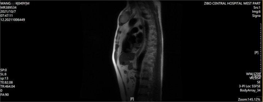 患者男性,49岁。因“发现胸骨肿物2月”于2021年10月入院。患者自诉伴有胸部疼痛。当地医院查胸骨MRI提示胸骨柄区占位、左侧约第4、5后肋水平占位及部分胸椎多发异常病灶。