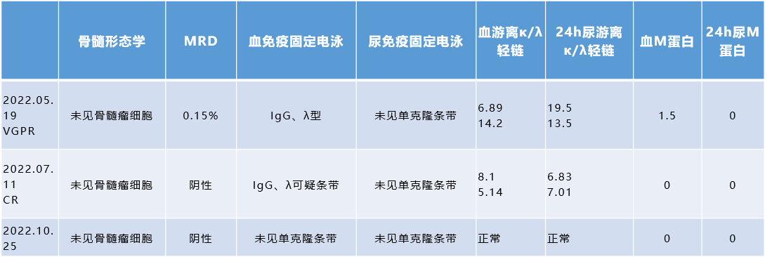 启用以伊沙佐米为基础的持续治疗方案至今,患者定期接受骨髓形态学、MRD、血/尿免疫固定电泳等指标监测,疗效持续保持sCR状态。治疗过程顺利,未出现治疗相关不良反应,患者生活质量高。
