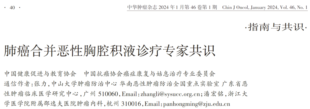 中国健康促进与教育协会, 中国抗癌协会癌症康复与姑息治疗专业委员会. 肺癌合并恶性胸腔积液诊疗专家共识[J]. 中华肿瘤杂志, 2024, 46(1):40-47. DOI:10.3760/cma.j.cn112152-20231130-00344 .