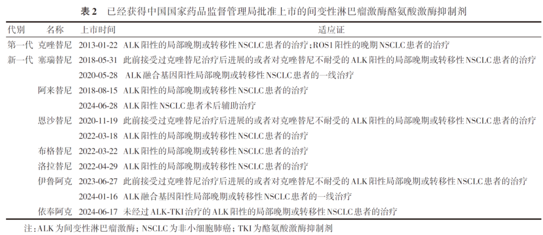 ALK-TKI通过抑制ALK融合蛋白磷酸化发挥抗肿瘤作用。截至2024年12月31日,被中国国家药品监督管理局(National Medical Products Administration,NMPA)批准上市的ALK-TKI有8个,包括克唑替尼、塞瑞替尼、阿来替尼、恩沙替尼、布格替尼、洛拉替尼、伊鲁阿克和依奉阿克(按照获得NMPA批准上市时间排序,表2)。已经发表研究结果尚未被NMPA批准上市的ALK-TKI有康太替尼、复瑞替尼、TGRX-326及SY-3505。