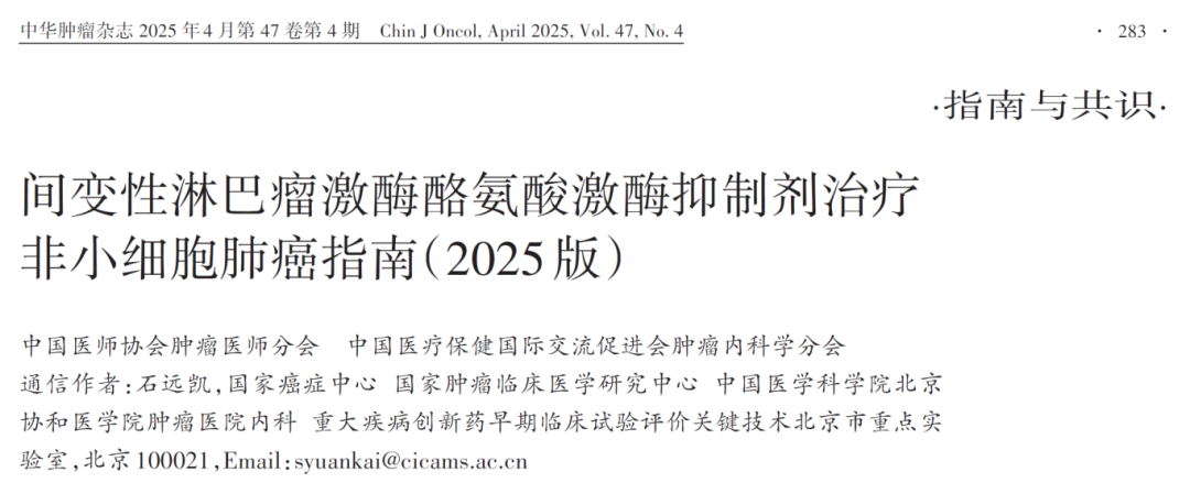 中国医师协会肿瘤医师分会, 中国医疗保健国际交流促进会肿瘤内科学分会. 间变性淋巴瘤激酶酪氨酸激酶抑制剂治疗非小细胞肺癌指南(2025版)[J]. 中华肿瘤杂志, 2025, 47(4): 283-297. DOI: 10.3760/cma.j.cn112152-20241130-00546 .
