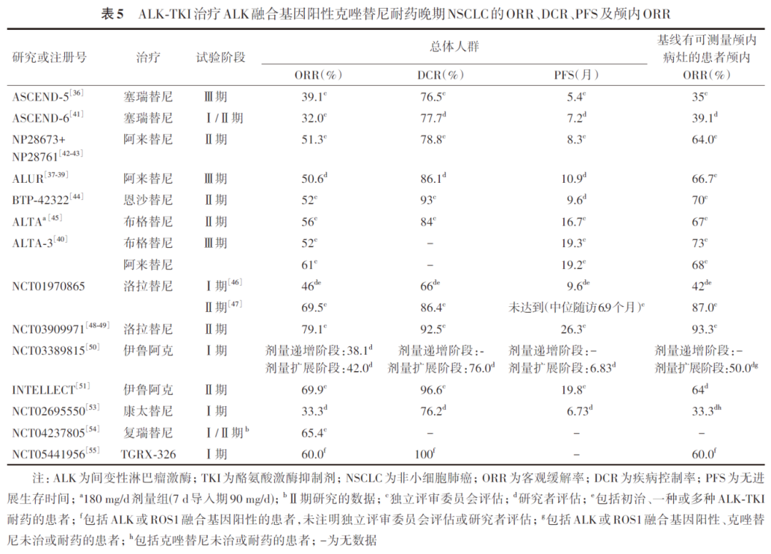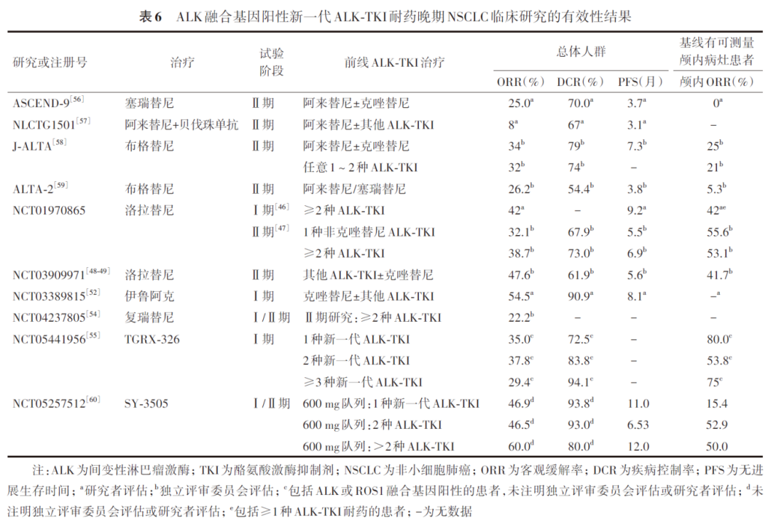 塞瑞替尼、阿来替尼联合贝伐珠单抗、布格替尼、洛拉替尼、伊鲁阿克、复瑞替尼、TGRX-326和SY-3505均开展了包括新一代ALK-TKI耐药人群的临床试验。上述药物均显示出一定的抗肿瘤活性,塞瑞替尼的ORR为25.0%,阿来替尼联合贝伐珠单抗的ORR为8%,布格替尼的ORR为26.2%~34%,洛拉替尼的ORR为32.1%~47.6%,伊鲁阿克的ORR为54.5%,复瑞替尼的ORR为22.2%,TGRX-326的ORR为29.4%~37.8%,SY-3505Ⅰ期临床试验的ORR为38.3%,Ⅱ期临床试验的ORR为47.5%(表6)。部分ALK-TKI耐药患者的耐药原因可能包括依赖ALK信号转导通路(ALK基因扩增和激酶域突变)和不依赖ALK信号转导通路(旁路激活和组织类型转化)等。旁路激活包括MET扩增/重排、EGFR激活/突变、KRAS突变、KIT扩增/激活、IGF1R激活、NF2突变、YES1扩增、DUSP6缺失等。克唑替尼常见耐药突变为L1196M、G1269A、C1156Y、F1174L等。塞瑞替尼常见耐药突变为G1202R、F1174C/L突变等,阿来替尼常见耐药突变为G1202R、I1171 N/S/T等,恩沙替尼常见耐药突变为G1269A、G1202R、E1210K等。洛拉替尼常见耐药突变以复合突变为主,包括C1156Y/L1198F、G1202R/L1196M、I1171N/D1203N等。体外实验结果显示,不同ALK-TKI对不同突变的ALK融合蛋白抑制活性不一致。因此,对于全身进展的患者,推荐在疾病进展后再次进行疾病进展部位肿瘤组织活检,以明确是否存在耐药突变。部分原ALK-TKI耐药突变可能对其他ALK-TKI敏感,例如EML4-ALK G1202R、EML4-ALK G1202del、EML4-ALK D1203N+E1210k耐药突变可能对洛拉替尼敏感;阿来替尼 EML4-ALK I1171 N/S、EML4-ALKL 1196M耐药突变可能对塞瑞替尼、布格替尼和洛拉替尼敏感;洛拉替尼L1198F耐药突变可能对克唑替尼治疗敏感等。因此,需要根据检测结果选择合适的ALK-TKI治疗。此外,对于多种ALK-TKI耐药的患者,可考虑含铂两药或非铂单药方案化疗。