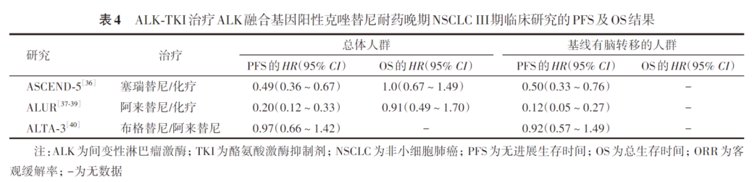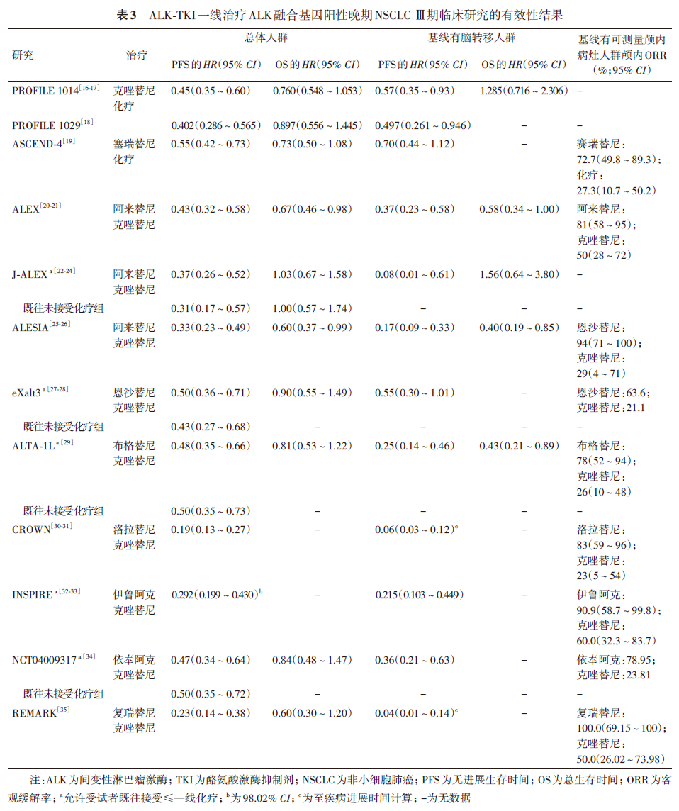 后续的多项研究对比了新一代ALK-TKI与克唑替尼的疗效。ALEX研究阿来替尼组的中位PFS为34.8个月(95% CI :17.7个月~无法评估),克唑替尼组的中位PFS为10.9个月(95% CI :9.1~12.9个月),两组对比的 HR 为0.43(95% CI :0.32~0.58, P <0.000 1)。J-ALEX研究阿来替尼组的中位PFS为34.1个月(95% CI :22.1个月~无法评估),克唑替尼组的中位PFS为10.2个月(95% CI :8.3~12.0个月),两组对比的 HR 为0.37(95% CI :0.26~0.52)。ALESIA研究阿来替尼组的中位PFS为41.6个月(95% CI :33.1~58.9个月),克唑替尼组的中位PFS为11.1个月(95% CI :9.1~18.4个月),两组对比的 HR 为0.33(95% CI :0.23~0.49)。eXalt3研究恩沙替尼组的中位PFS为31.3个月(95% CI :20.2个月~无法评估),克唑替尼组的中位PFS为12.7个月(95% CI :9.2~16.6个月),两组对比的 HR 为0.50(95% CI :0.36~0.71, P <0.001)。ALTA-1L研究布格替尼组的中位PFS为24.0个月(95% CI :18.5~43.2个月),克唑替尼组的中位PFS为11.1个月(95% CI :9.1~13.0个月),两组对比的 HR 为0.48(95% CI :0.35~0.66, P <0.001)。CROWN研究洛拉替尼组的中位PFS未达到,克唑替尼组的中位PFS为9.1个月(95% CI :7.4~10.9个月),两组对比的 HR 为0.19(95% CI :0.13~0.27)。INSPIRE研究伊鲁阿克组的中位PFS为45.90个月(95% CI :28.32个月~无法评估),克唑替尼组的中位PFS为14.55个月(95% CI :11.07~16.53个月),两组对比的 HR 为0.292(98.02% CI :0.199~0.430, P <0.001)。依奉阿克的Ⅲ期临床研究依奉阿克组的中位PFS为24.87个月(95% CI :15.64~30.36个月),克唑替尼组的中位PFS为11.60个月(95% CI :8.28~13.73个月),两组对比的 HR 为0.47(95% CI :0.34~0.64, P <0.001)。复瑞替尼的Ⅲ期临床研究复瑞替尼组的中位PFS未达到(95% CI :无法评估~无法评估),克唑替尼组的中位PFS为13.93个月(95% CI :11.07~19.35个月),两组对比的 HR 为0.23(95% CI :0.14~0.38, P <0.001)。阿来替尼、恩沙替尼、布格替尼、洛拉替尼、伊鲁阿克和依奉阿克的临床试验结果均显示,与克唑替尼相比均具有更长的PFS(表3),因此这些药物成为一线治疗的优先选择。但值得注意的是,目前仅有阿来替尼实现了总生存时间(overall survival, OS)获益,克唑替尼、赛瑞替尼、恩沙替尼、布格替尼均未能实现OS获益,洛拉替尼、伊鲁阿克、依奉阿克和复瑞替尼的OS数据尚不成熟。
