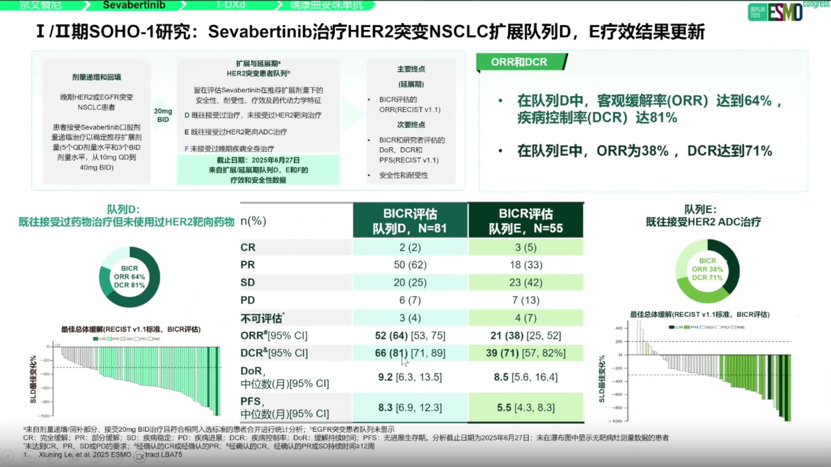 此外,Sevabertinib 也在大会中披露了亚洲患者的数据,SOHO-1研究扩展队列D数据显示:针对既往经治队列D中的亚洲患者,ORR为61%,DCR为79%,中位PFS达8.3个月,中位DoR为12.6月。