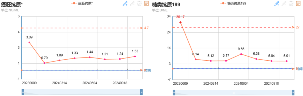 肿瘤标志物动态监测显示癌胚抗原(CEA)和糖类抗原199(CA199)均在治疗后迅速下降,并长期维持在正常范围内。