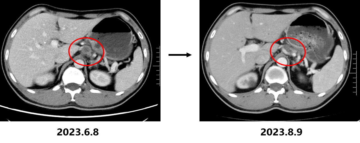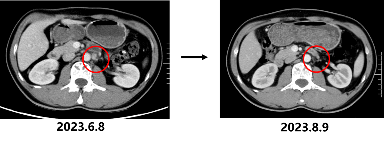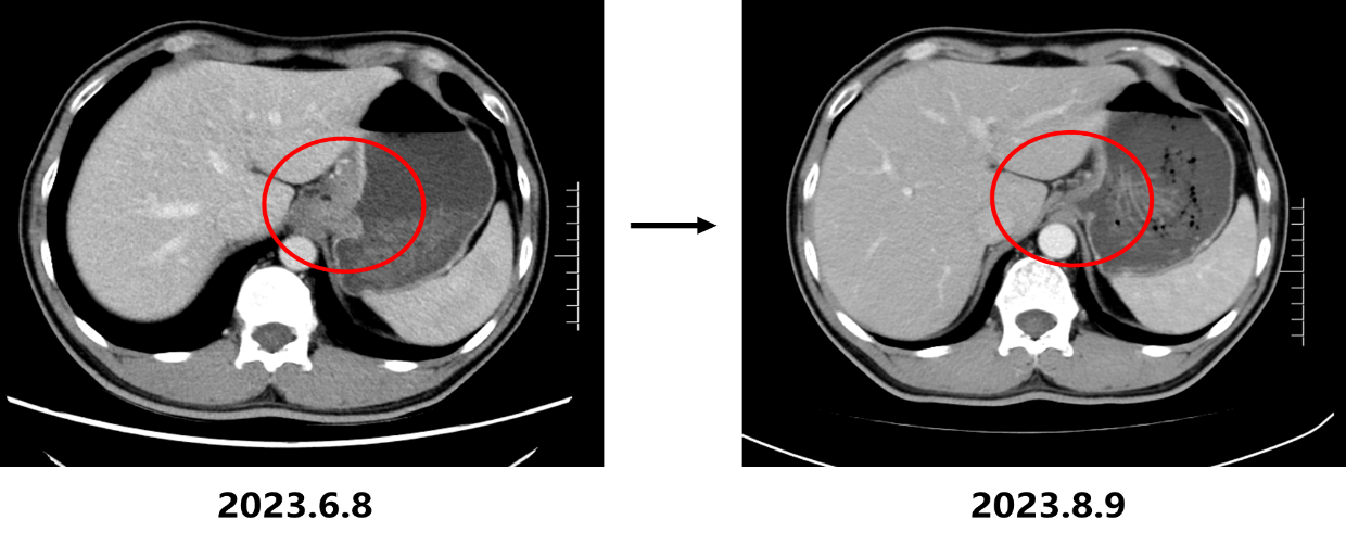 • 2023.8.10复查CT:胃底贲门部胃壁增厚明显改善,肝胃间隙及腹膜后多发淋巴结转移瘤较前缩小(大者短径17mm)、双肺多发转移瘤较前缩小、减少,疗效评估为部分缓解(PR)。