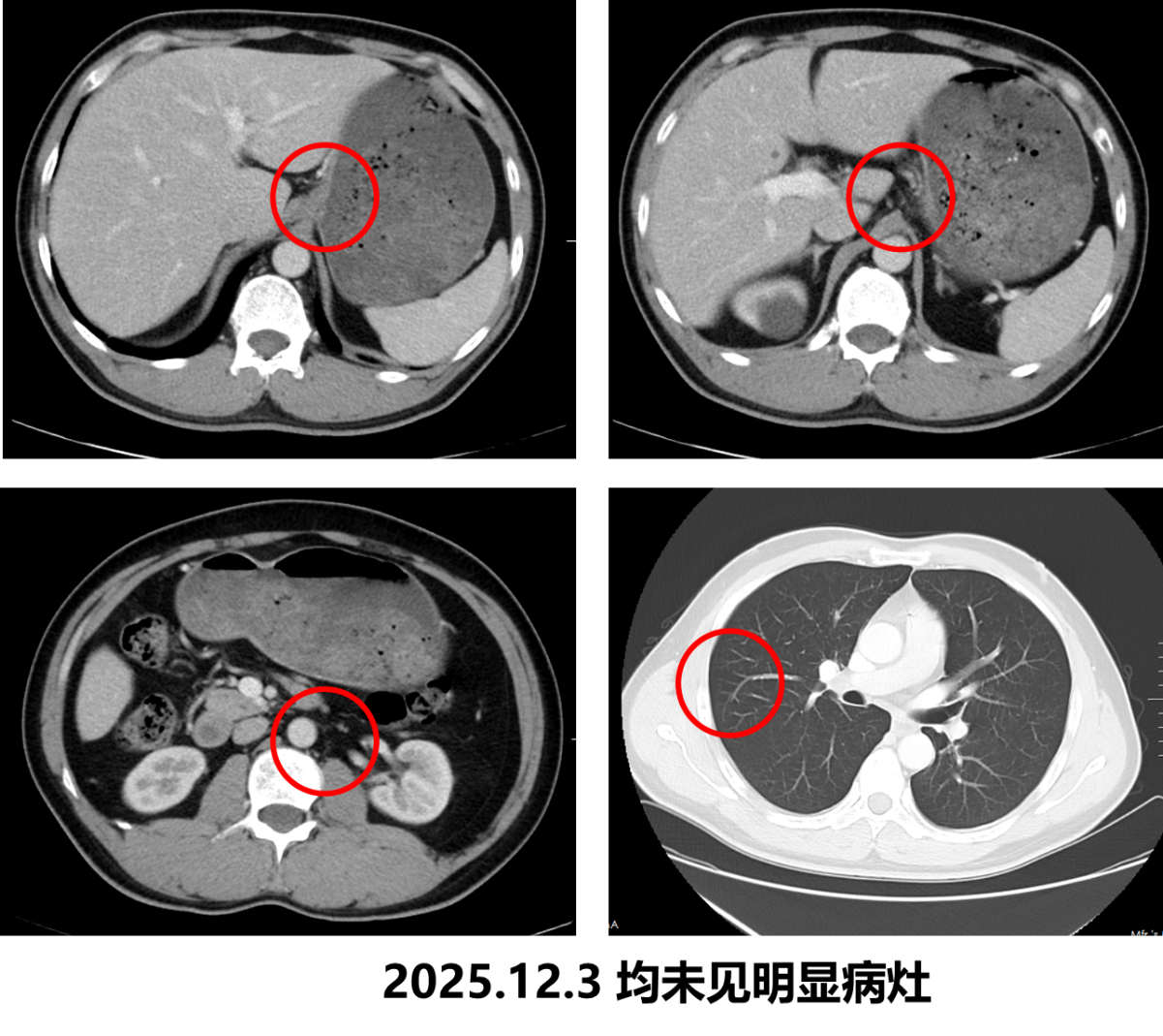 • 2025.12.3 复查CT:胃底贲门部胃壁稍厚大致同前,肝胃间隙、腹膜后小淋巴结同前。双肺纤维灶大致同前。