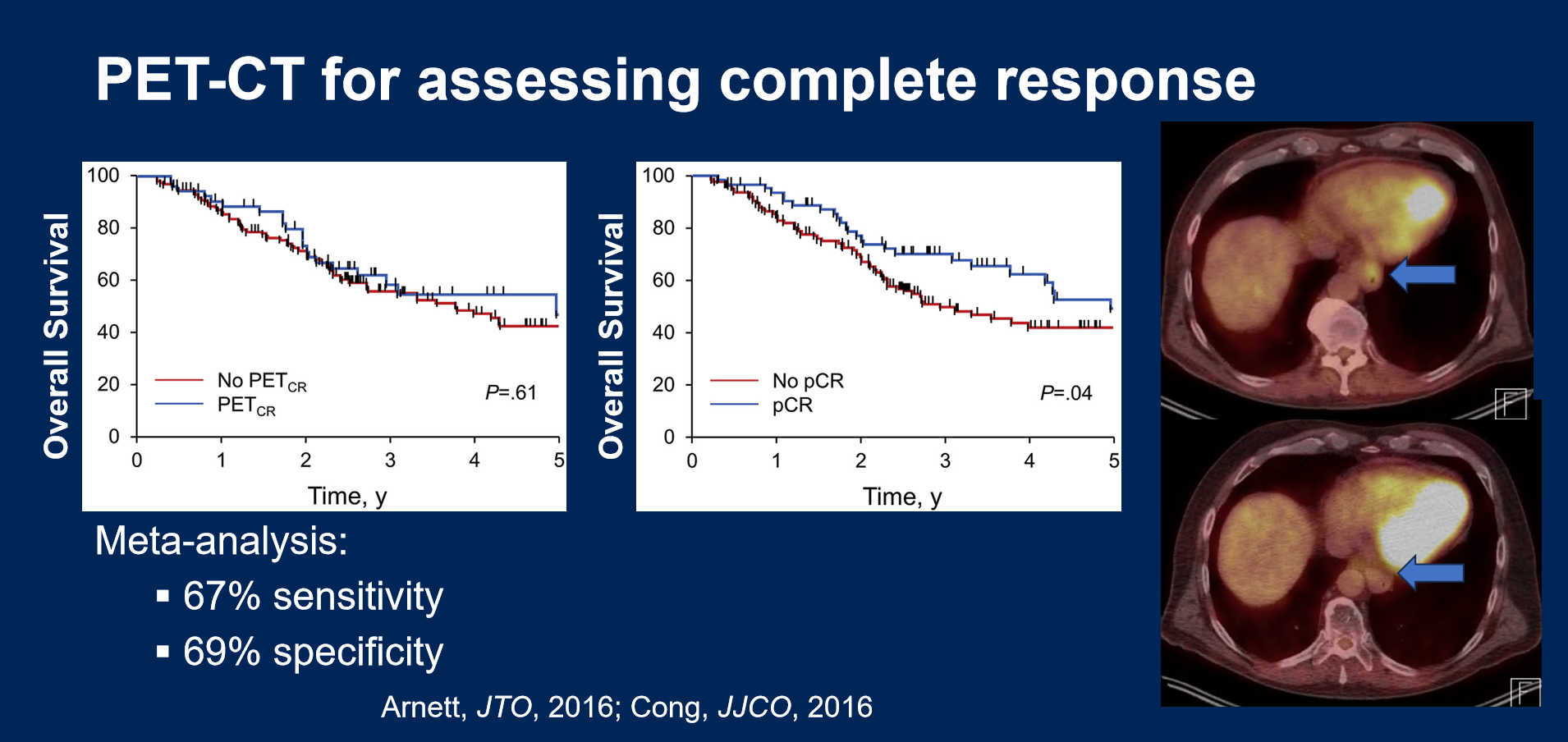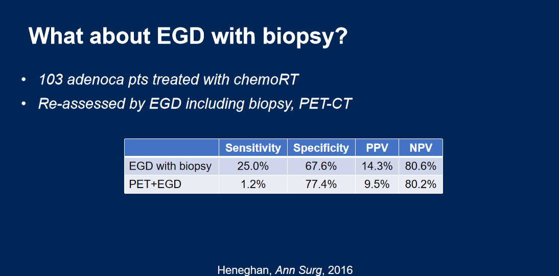 要确定哪些患者可以被纳入观察范围,首先需要明确临床完全缓解(cCR)与病理完全缓解(pCR)之间的关系。虽然PET-CT是目前评估疗效的重要无创手段,但其在确认pCR方面的灵敏度与特异性仅为2/3左右,表现尚不够完美。一项研究显示,103例胃癌患者使用放化疗治疗后,通过胃镜结合活检或PET-CT重新评估时,其阴性预测值(NPV)约为80%,但在灵敏度方面表现较差。
