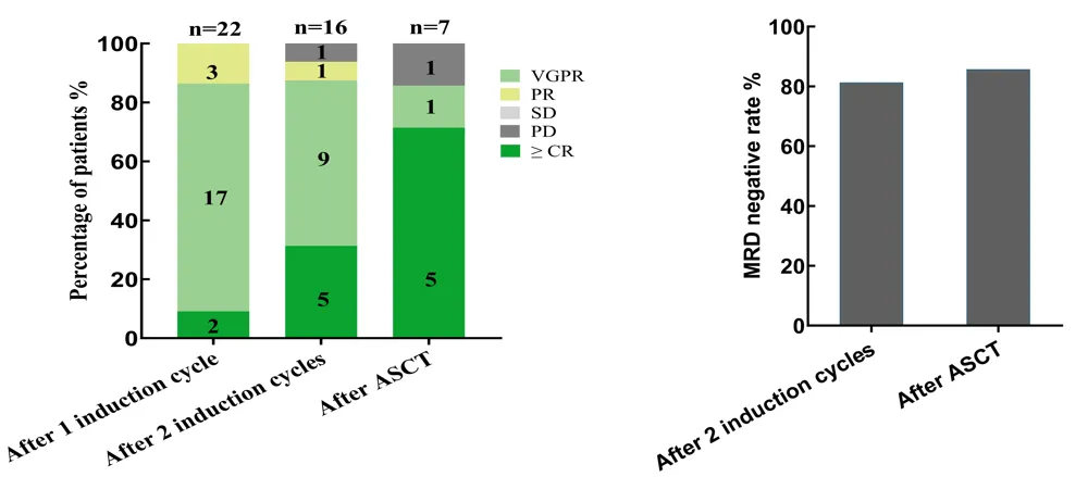截至2025年7月,该研究对已入组的22名患者进行了初步分析。患者中位年龄54岁,32%患者为R-ISS II期,64%患者为III期。8例患者为双打击MM,2例为del(17p)/TP53变异MM,7例原发性浆细胞白血病(pPCL),5例患者为髓外病变(EMD)。经过1个周期Dara-KRd-PACE方案诱导治疗后,所有22名患者均观察到治疗反应,总体缓解率为100%,其中86.4%的患者达到了非常好的部分缓解(VGPR)以上的疗效。完成2个周期治疗的16名患者中,疗效进一步加深,≥VGPR率为87.5%,严格意义的完全缓解(sCR)率达到31.3%,并且81.3%的患者达到了微小残留病(MRD)阴性(10-5)状态。已完成移植的7名患者,深度缓解率更高,sCR率达到71.4%, MRD阴性率为85.7%。