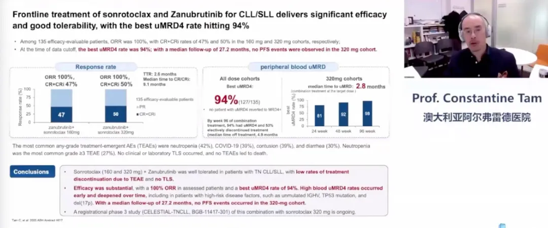 在介绍完SEQUOIA研究重磅数据后,Tam教授表示,在探索如何改善CLL患者生存结局的道路上,研究者不仅对BTKi进行迭代升级,亦尝试对有限期治疗方案中的BCL-2抑制剂进行优化。其中,泽布替尼与新一代BCL-2抑制剂索托克拉(sonrotoclax)的“强强联合”有限期治疗方案展现了广阔前景。BGB-11417-101研究中,泽布替尼联合索托克拉全口服有限期方案在初治CLL中实现了100%的客观缓解率(ORR)以及94%的微小残留病阴性(uMRD)率。特别是在320mg剂量组,治疗2年时的uMRD率高达98%,中位至uMRD时间仅为2.8个月。得益于较深的缓解深度,大多数(78%)完成治疗的患者因达到良好疗效而选择性停药在生存获益方面,中位随访27.2个月,320mg剂量组未观察到任何疾病进展事件。同时,该联合方案安全性优异,研究中未发生肿瘤溶解综合征(TLS),亦未出现因不良事件导致的死亡。