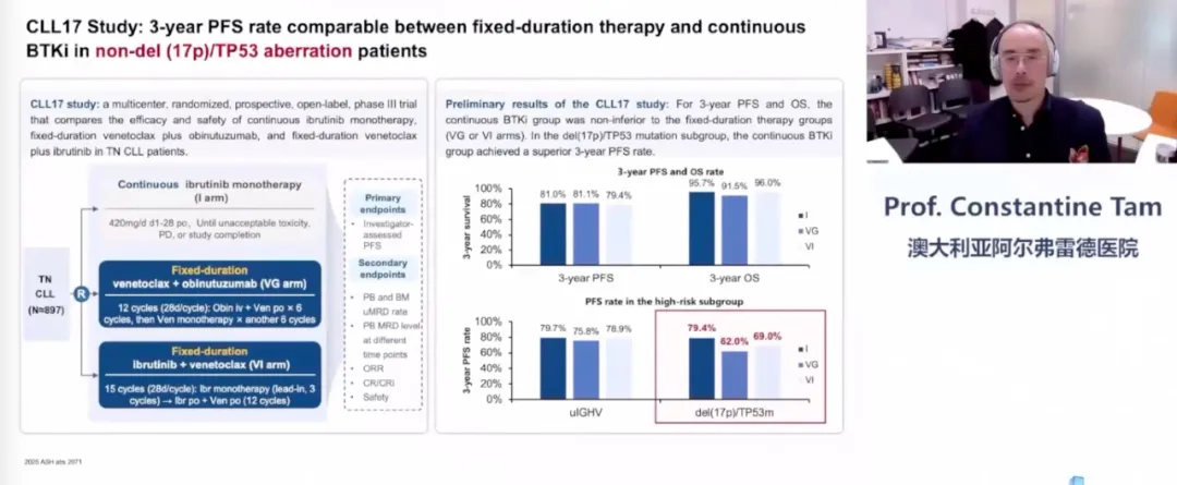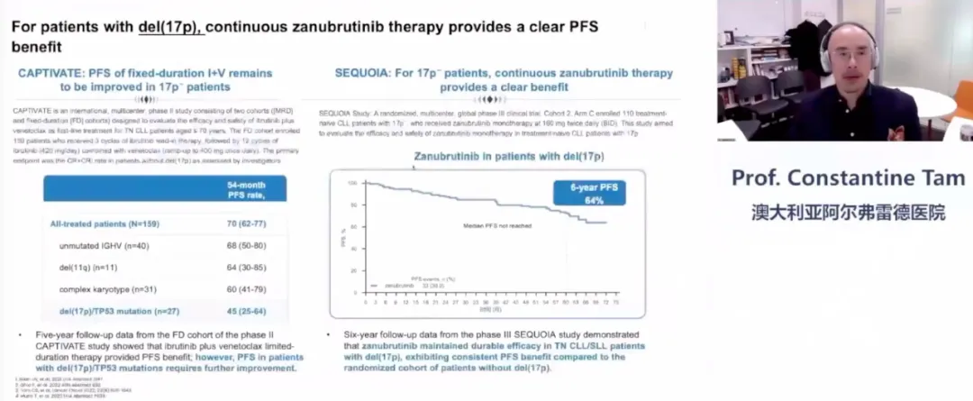 随着新型治疗模式的涌现,CLL患者有了越来越多的选择。然而,这也为CLL临床实践带来了新的挑战。对此,Tam教授指出,尽管有限期治疗在部分CLL患者中展现了潜力,但基于SEQUOIA C组和CLL17等研究的启示,对于伴有del(17p)/TP53突变的高危患者,BTKi持续治疗的获益依然优于有限期治疗。因此,BTKi持续治疗仍然是CLL一线治疗的“金标准”。