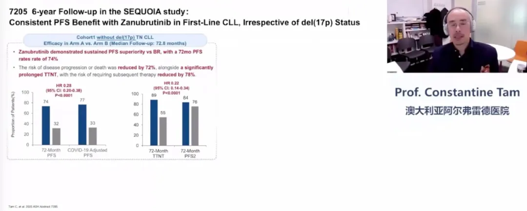 首先,Tam教授着重分享了SEQUOIA研究的最新数据。该研究的6年(72个月)随访数据,为泽布替尼一线治疗CLL的长期疗效与安全性优势提供了确凿证据。在无del(17p)的患者中(A组 vs B组),泽布替尼单药持续治疗展现了显著优于传统免疫化疗(BR方案)的疗效,其72个月无进展生存(PFS)率高达74%,而BR组仅为32%。此外,泽布替尼将初治CLL患者的疾病进展或死亡风险大幅降低了72%(HR:0.28)。