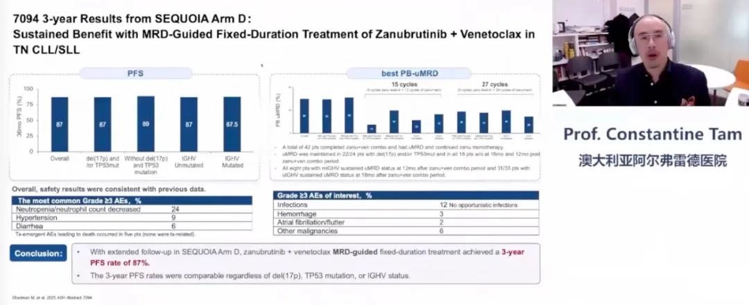 此外,除持续治疗外,SEQUOIA研究D组探索了“泽布替尼+BCL-2抑制剂”有限期治疗方案在初治CLL中的疗效。数据显示,该联合方案的3年PFS率高达87%,且无论患者是否伴有del(17p)或IGHV突变,其PFS获益均保持高度一致。在深度缓解方面,虽然伴有del(17p)的患者达到MRD阴性(uMRD)的速度较慢,但随着治疗延长,最终也能获得良好的深度缓解,数据显示治疗2年时该亚组uMRD率提升至38%。这表明,即便是伴有del(17p)或IGHV未突变的高危患者,随着治疗时间的延长,同样能实现MRD转阴,且安全性良好,因不良反应导致停药的病例较少。