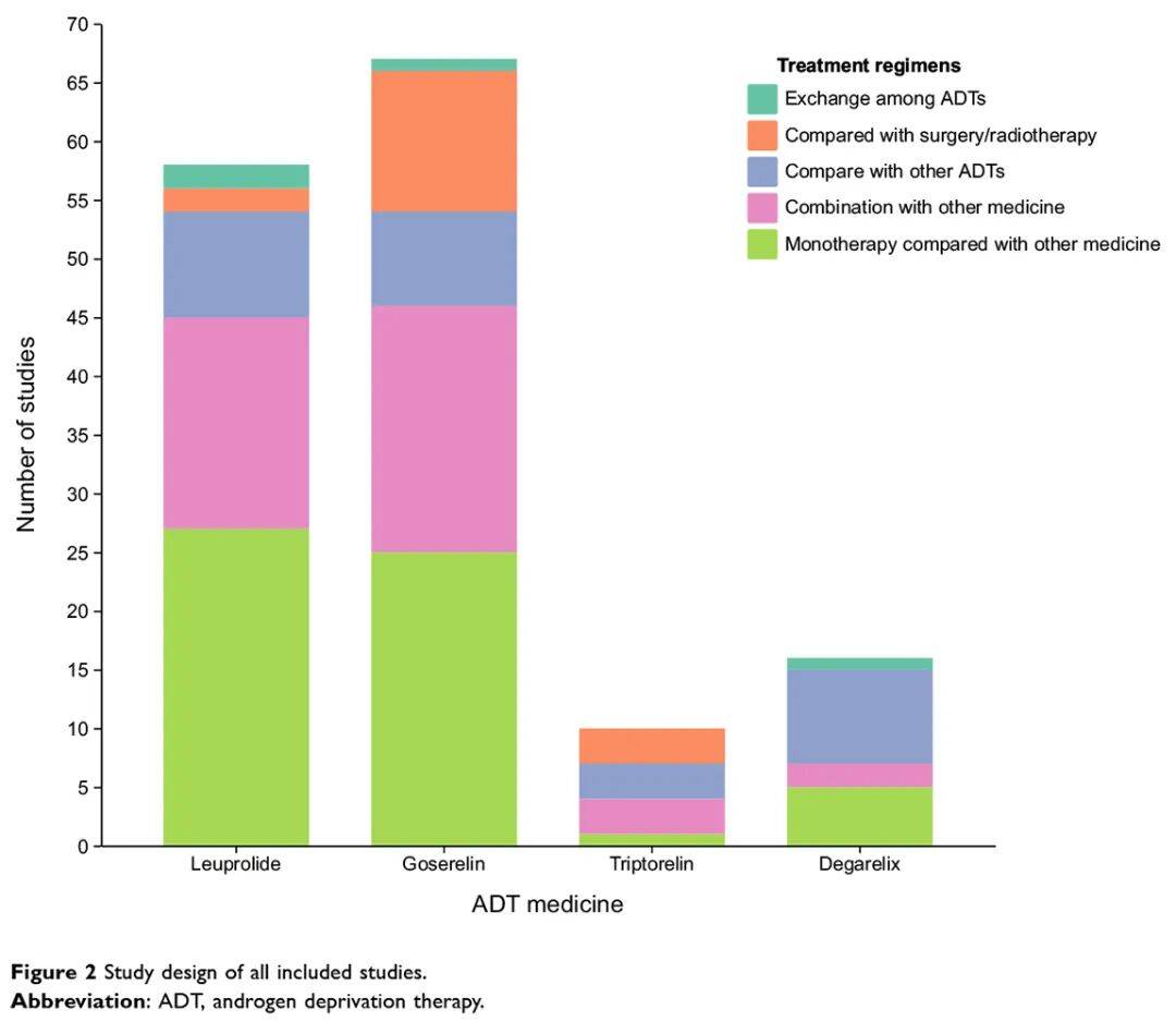 最终纳入160篇文献,共包含126项随机对照试验(RCT),其中评估亮丙瑞林、戈舍瑞林、曲普瑞林和地加瑞克的研究分别为52、67、10和16项。ADT主要用药方案包括单药治疗、以及与第一代抗雄激素药物、新型内分泌药物及其他治疗联合的方案。大部分评估亮丙瑞林和戈舍瑞林的RCT研究涵盖了上述四种用药模式。由于曲普瑞林和地加瑞克获批时间相对较晚,相关研究主要集中于单药治疗。纳入的研究中仅6项来自中国。