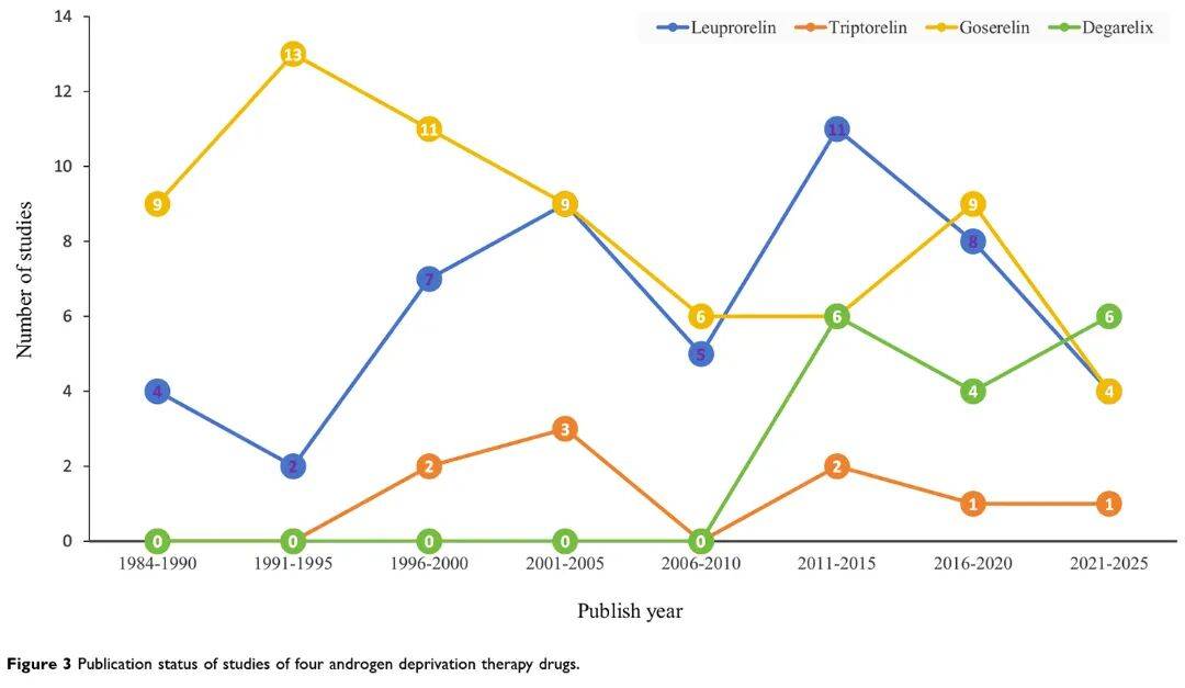 检索PubMed、Embase及Cochrane Library数据库,纳入截至2025年9月发表的相关文献,对纳入研究的主要特征进行统计分析,重点关注临床研究中四种ADT药物用药方案的演变情况。