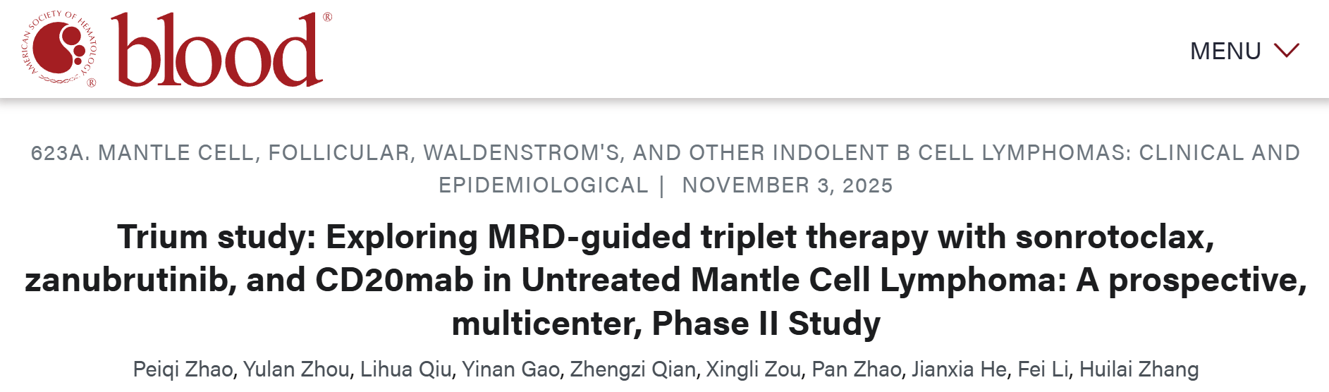 [1] Peiqi Zhao, Yulan Zhou, Lihua Qiu, et al. Trium study: Exploring MRD-guided triplet therapy with sonrotoclax, zanubrutinib, and CD20mab in Untreated Mantle Cell Lymphoma: A prospective, multicenter, Phase II Study. Blood 2025; 146 (Supplement 1): 1809.