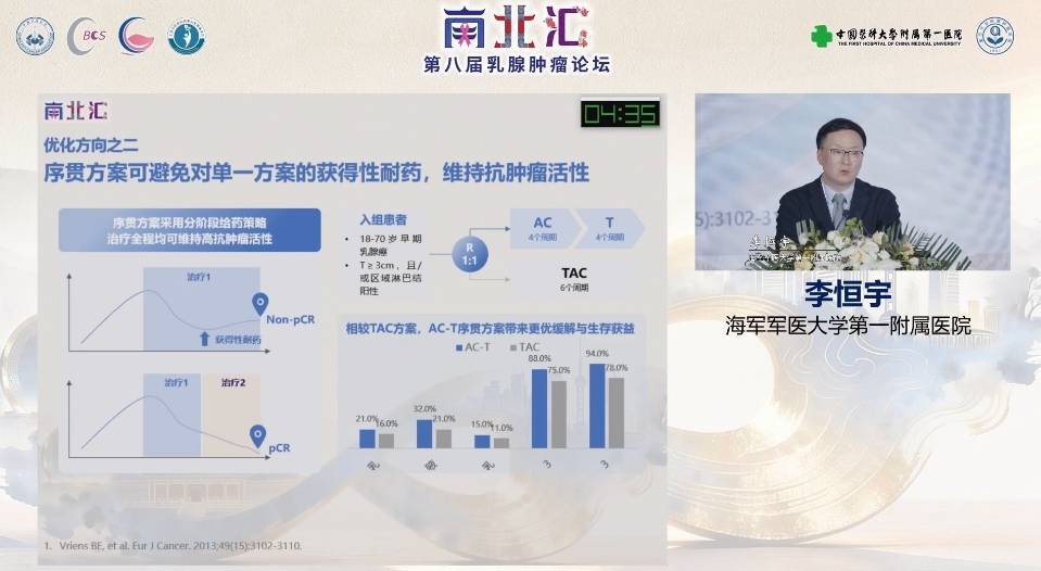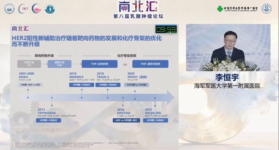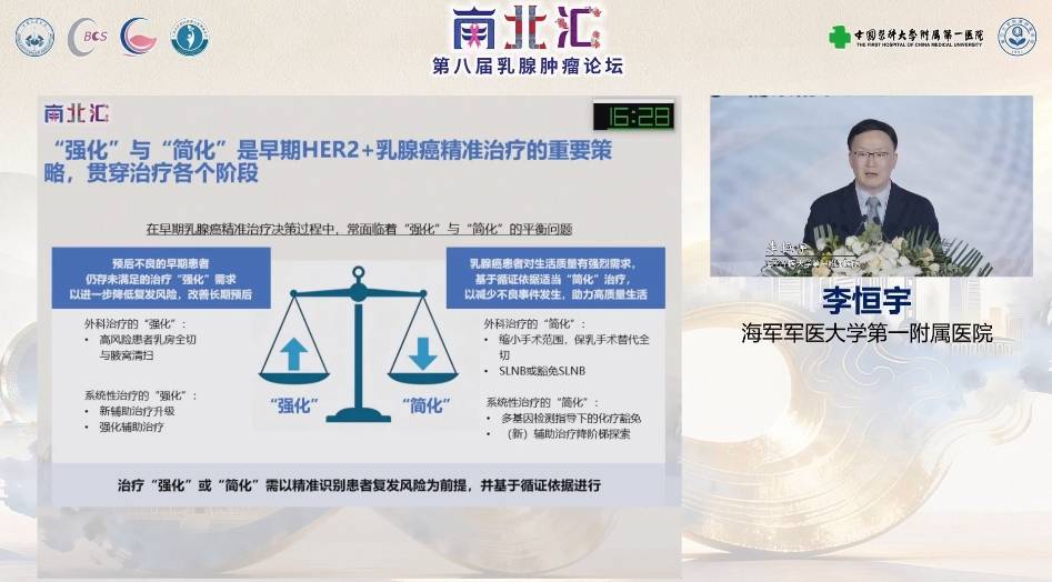 2026年3月,由中国医科大学附属第一医院、复旦大学附属肿瘤医院共同承办的2026年南北汇第八届乳腺肿瘤论坛于沈阳正式开幕。众多乳腺肿瘤领域学者相聚沈城,共赴盛会。海军军医大学第一附属医院李恒宇教授围绕HER2阳性早期乳腺癌治疗中的“强化”与“简化”发表了精彩的主题演讲。报告强调,在复杂多变的肿瘤生物学特性下,应通过精准评估实现患者生存获益与生活质量的平衡。【肿瘤资讯】整理如下,以飨读者。