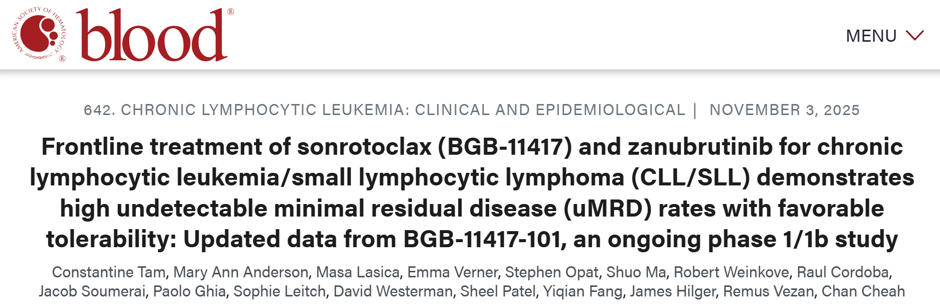 [1]Constantine Tam, Mary Ann Anderson, Masa Lasica, et al. Frontline treatment of sonrotoclax (BGB-11417) and zanubrutinib for chronic lymphocytic leukemia/small lymphocytic lymphoma (CLL/SLL) demonstrates high undetectable minimal residual disease (uMRD) rates with favorable tolerability: Updated data from BGB-11417-101, an ongoing phase 1/1b study. Blood 2025; 146 (Supplement 1): 3891.