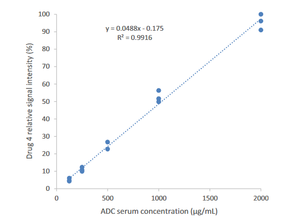 浓度梯度实验结果显示,aLC-MS方法在125-2000μg/mL血清浓度范围内线性良好(R²=0.99),灵敏度可达31.25μg/mL,即使在ADC占血清总蛋白比例仅0.25%的低浓度下,仍能获得良好的MS信号,且DAR和DLD结果稳定。