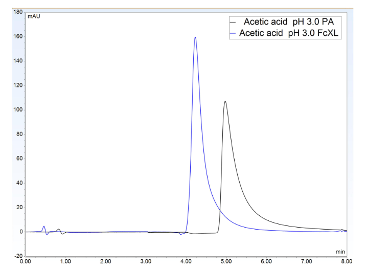 色谱柱优化结果显示,POROS CaptureSelect FcXL亲和色谱柱(FcXL柱)在峰对称性、尖锐度和强度上优于MabPac Protein A柱,且对人IgG的选择性更高,肽图分析证实其可减少血清中杂蛋白的干扰,因此确定为核心色谱柱。