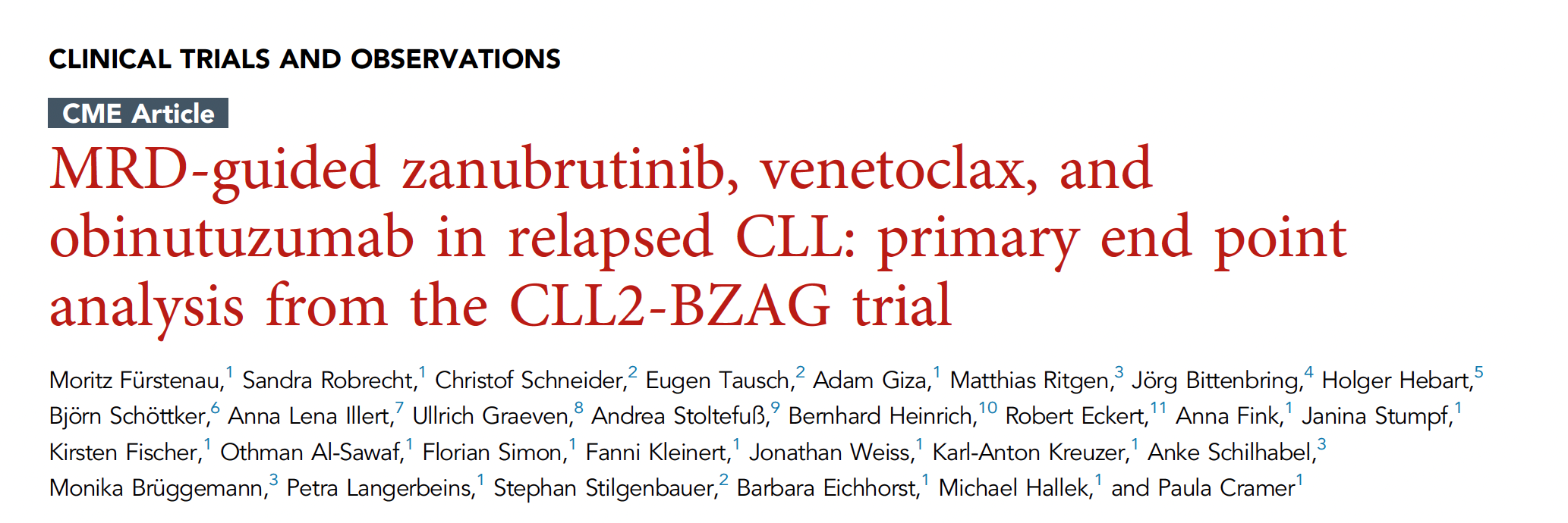 [1]Moritz Fürstenau, Sandra Robrecht, Christof Schneider, et al. MRD-guided zanubrutinib, venetoclax, and obinutuzumab in relapsed CLL: primary end point analysis from the CLL2-BZAG trial. Blood. 2025; 145(12):1282-1292.