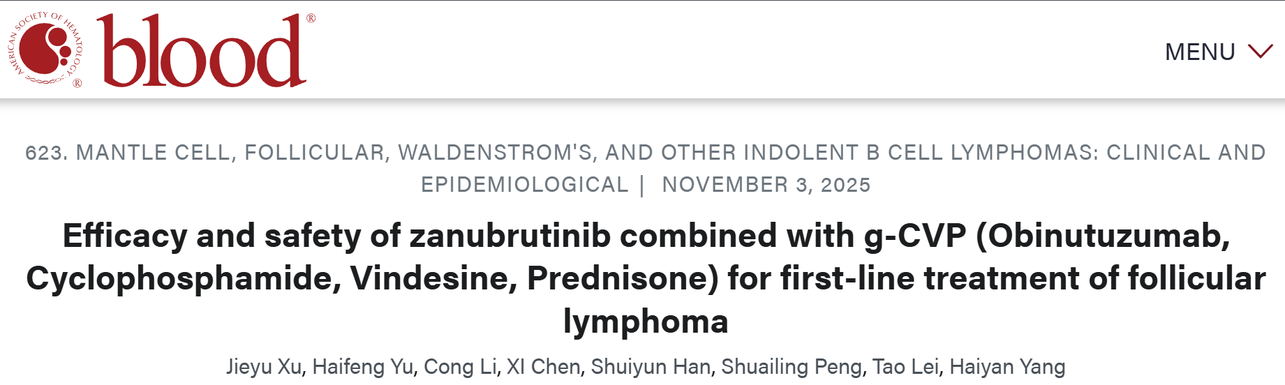 [1]Jieyu Xu, Haifeng Yu, Cong Li, et al. Efficacy and safety of zanubrutinib combined with g-CVP (Obinutuzumab, Cyclophosphamide, Vindesine, Prednisone) for first-line treatment of follicular lymphoma. Blood 2025; 146 (Supplement 1): 7103.