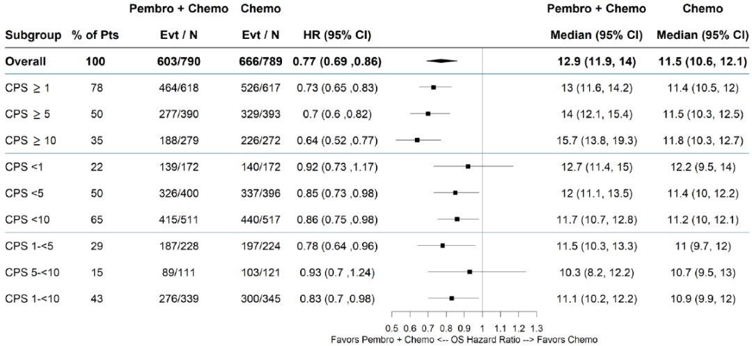KEYNOTE-859研究 也观察到类似趋势,帕博利珠单抗联合化疗相比于单用化疗的OS HR在CPS≥10、≥5和≥1的人群中分别为0.64、0.70和0.73,CPS<10和<1的人群仅为0.86和0.92,CPS≥1~<5、≥1~<10、≥5~<10的人群分别为0.78、0.83和0.93 [11] 。