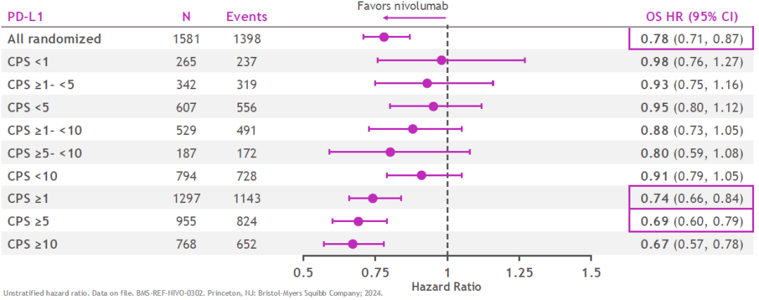 在 CheckMate-649研究 中,纳武利尤单抗联合化疗相比于单用化疗的总生存期(OS)HR在CPS≥10、≥5和≥1的人群中分别为0.67、0.69和0.74,CPS<10和<1的人群仅为0.91和0.98,CPS≥1~<5、≥1~<10、≥5~<10的人群分别为0.93、0.88和0.80 [11] 。