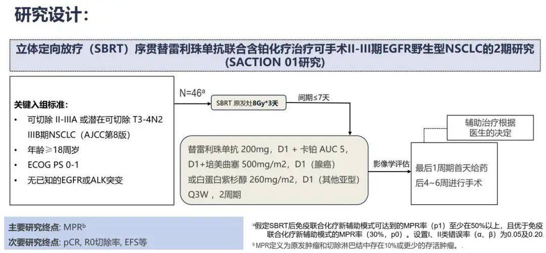 SACTION01研究是一项开放标签、单臂、II期临床研究。纳入可切除的IIA至IIIB期(根据AJCC第8版)NSCLC患者,ECOG体能状态评分0-1分,无已知EGFR/ALK突变。患者接受SBRT(24 Gy/3次)照射原发肿瘤,并进行2个周期的替雷利珠单抗联合铂类化疗。新辅助治疗后4-6周进行手术切除。主要研究终点为主要病理缓解(MPR),次要研究终点包括无事件生存期(EFS)、总生存期(OS)、生物标志物分析等。