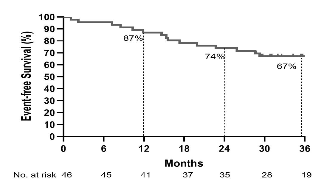 截至2025年12月,中位随访时间为37个月(95%CI:35.8-37.7)。36个月EFS率、36个月OS率分别为67.3%(95% CI:51.6-78.5)和89.1%(95% CI:75.7-95.5)。pCR(HR:0.46;95% CI:0.17-1.24;P=0.13)和MPR(HR:0.50;95% CI:0.15-1.71;P=0.27)与3年EFS率无显著相关性。