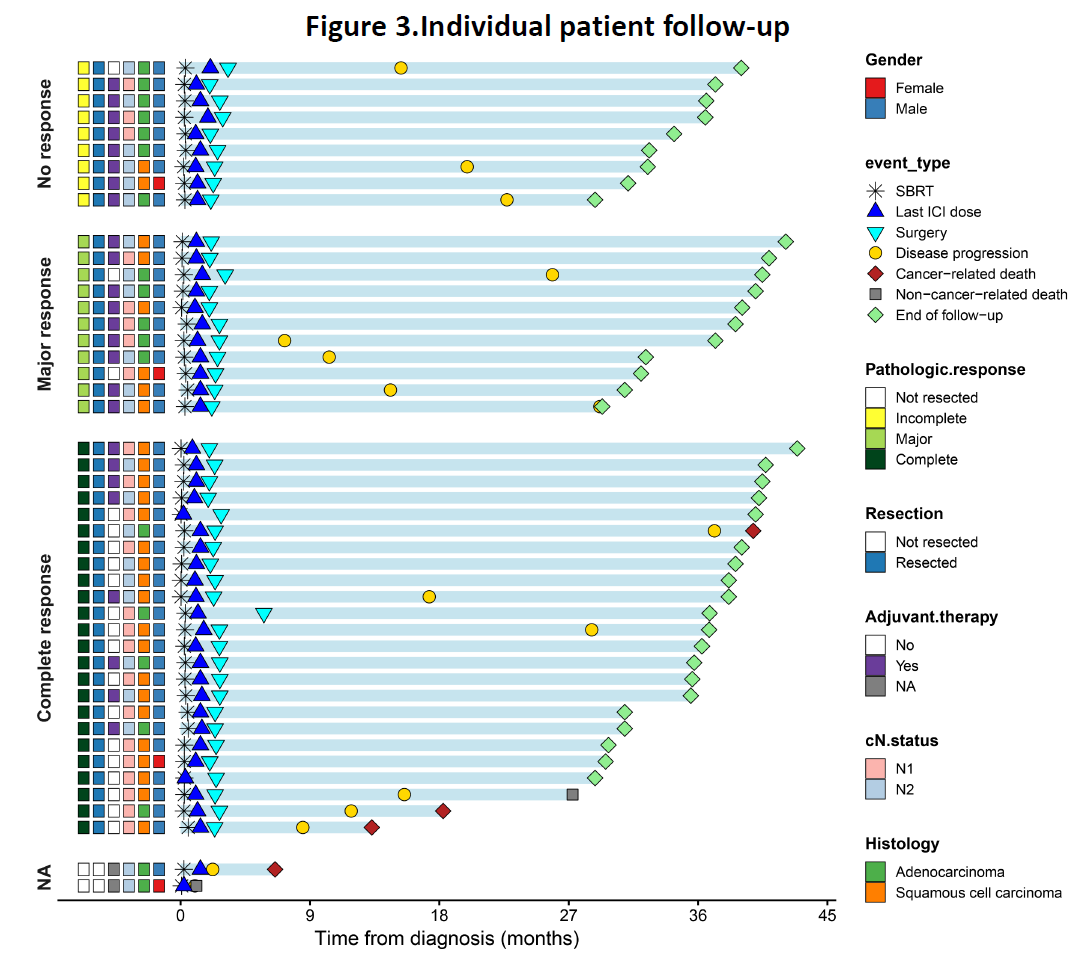 2023年欧洲肿瘤内科学会(ESMO)大会以LBA60形式报告初步研究结果,发现新辅助SBRT序贯替雷利珠单抗联合化疗获得了较高的病理反应(MPR率: 76.1%; pCR率: 52.2%),并且安全性可耐受2。2024年9月,该研究的初步研究成果已经在著名国际期刊《柳叶刀·呼吸医学》(The Lancet Respiratory Medicine)在线发表3。本次会议中更新该研究的三年生存结果。