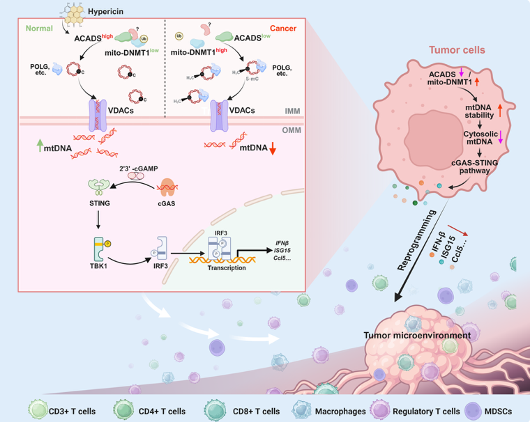 近日,陆军军医大学缪洪明教授团队在Signal Transduction and Targeted Therapy杂志发表题为Short-chain acyl-CoA dehydrogenase initiates mtDNA demethylation and leakage to fuel antitumor immunity in colorectal cancer的研究成果。 该研究发现,结肠癌细胞中的短链酰基辅酶A脱氢酶(ACADS)可通过线粒体DNMT1(mito-DNMT1) 调控mtDNA甲基化及遗漏,最终调节cGAS-STING通路依赖的肿瘤免疫微环境和CRC进展