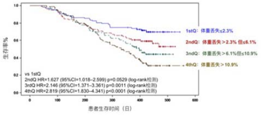 从上图可以看出,体重丢失越明显,生存率越低,远期治疗效果越差。