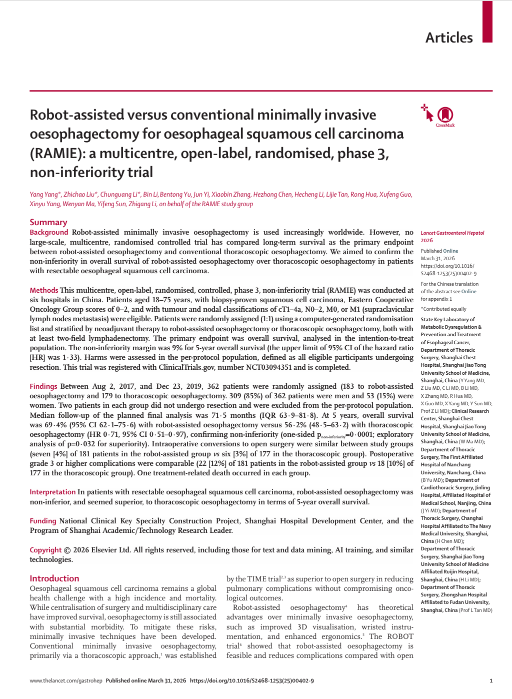 李志刚教授团队牵头开展的全国多中心临床研究RAMIE取得最新进展,相关成果发表于Lancet Gastroenterology & Hepatology