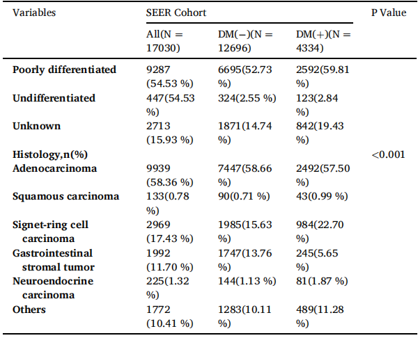 本研究在SEER数据库中共纳入了17030名T2-T4期胃癌患者,其中有4334名患者(25.45%)发生了远处转移(DM(+)组),而12696名患者(74.55%)未发生远处转移(DM(-)组)。在临床病理特征上,DM(+)组与DM(-)组在多个因素上存在显著差异(所有P<0.05)。DM(+)组中年龄小于65岁的患者比例显著高于DM(-)组(54.71%vs.43.49%,P<0.001),且DM(+)组中肿瘤大于4 cm的患者比例较高。此外,DM(+)组中AJCC N1期患者的比例为40.29%,高于其他N分期亚组(如N0的35.23%),且单发肿瘤的比例远高于多发肿瘤(82.23%vs.17.77%,P<0.001)。在组织学上,低分化或未分化的胃癌、以及腺癌的比例在DM(+)组中均更高。