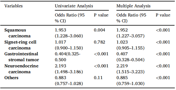 表2 训练集中变量的单变量与多变量逻辑回归分析