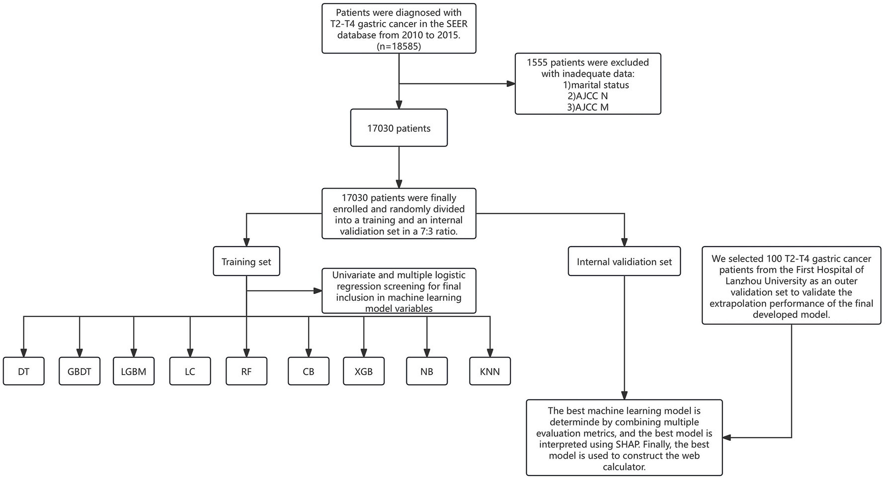 本研究采用回顾性队列研究设计,主要使用了美国人群癌症数据库SEER。该数据库由国家癌症研究所创建,代表了大约28%的美国人口。主要研究队列共纳入了17030名T2-T4期胃癌患者。SEER数据被随机分为训练集(n=11921)和内部验证集(n=5109),比例为7:3。此外,本研究纳入了来自兰州大学第一医院的100名胃癌患者数据作为外部验证集。