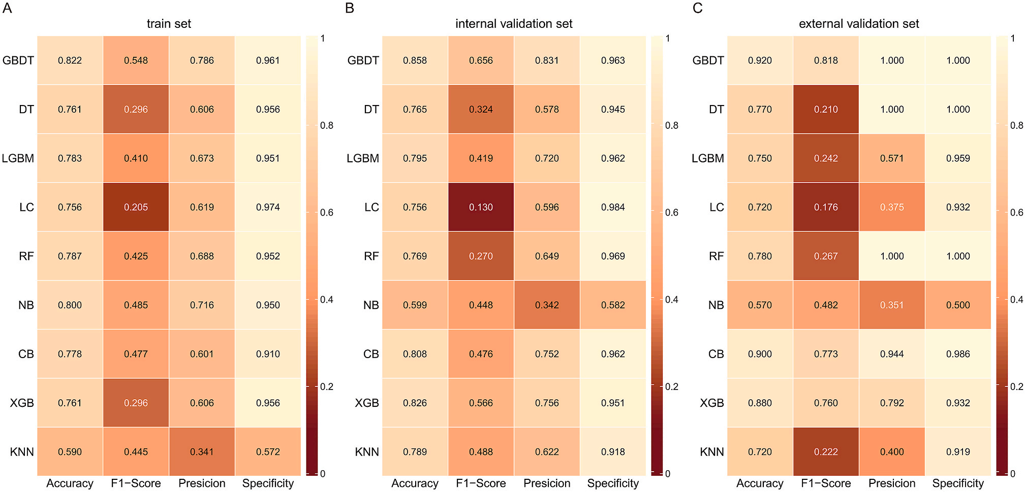 本研究使用了九种机器学习算法来构建预测模型,包括决策树(DT)、梯度提升决策树(GBDT)、LightGBM(LGBM)、Logistic分类(LC)、随机森林(RF)、CatBoost(CB)、eXtreme Gradient Boosting(XGB)、朴素贝叶斯(NB)和K近邻(KNN)。通过区分能力(Discrimination)、校准度(Calibration)、临床效益(Clinical Utility)、准确率(Accuracy)、F1-分数(F1-score)、精确率(Precision)和特异性(Specificity)等来评估模型性能。