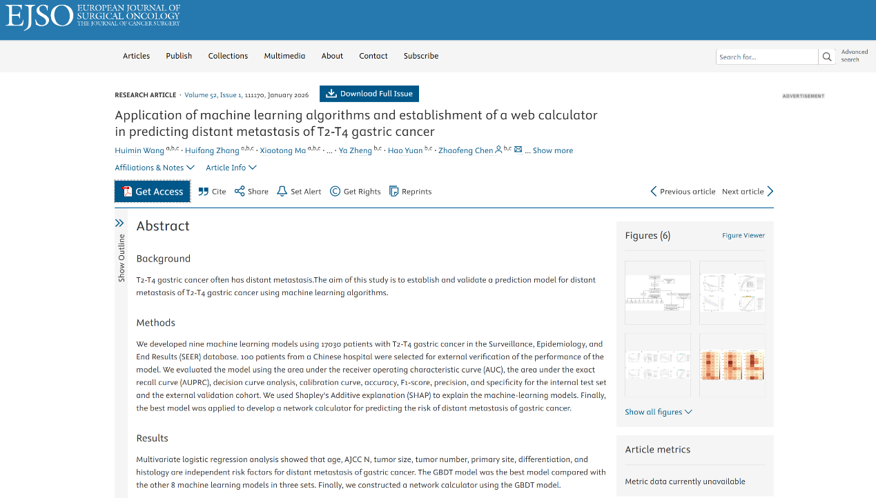 [1]Wang H, Zhang H, Ma X, et al. Application of machine learning algorithms and establishment of a web calculator in predicting distant metastasis of T2-T4 gastric cancer. Eur. J. Surg. Oncol. 2026;52:111170. doi:10.1016/j.ejso.2025.111170.