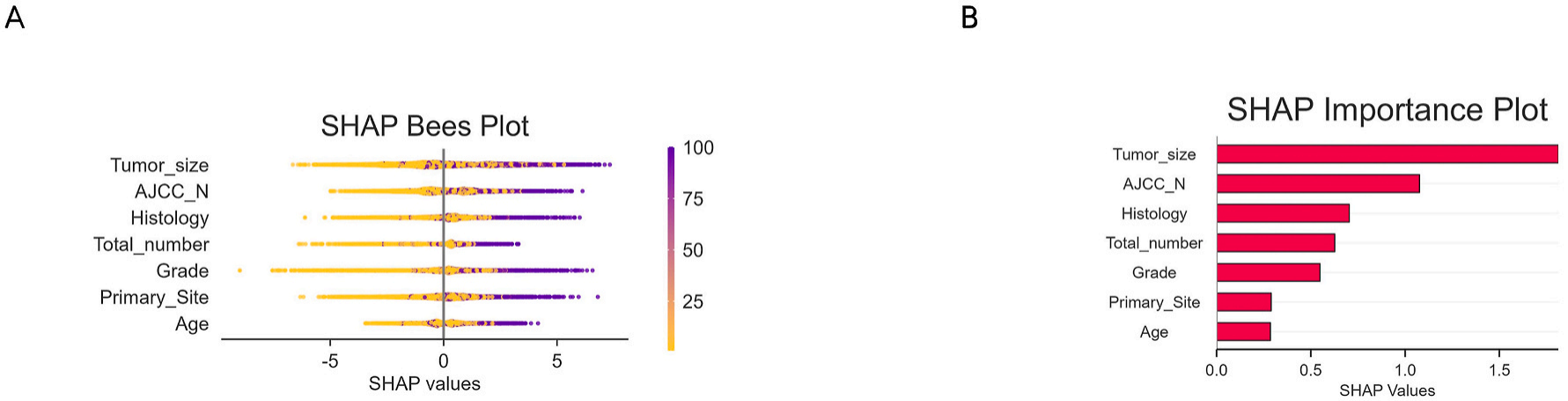 通过SHAP(Shapley's Additive explanation)可解释性分析,确定了七个独立风险因素在GBDT模型中的相对重要性。重要性从高到低依次为:肿瘤大小(SHAP值最大,为1)、AJCC N分期(SHAP值大于1但小于肿瘤大小)、组织学类型、肿瘤数量、分化程度、原发部位和年龄。鉴于GBDT模型的复杂性不适合临床推广,本研究最终基于GBDT模型构建了一个网络计算器,以实现T2-T4期胃癌远处转移风险的个体化、实时和可视化预测。