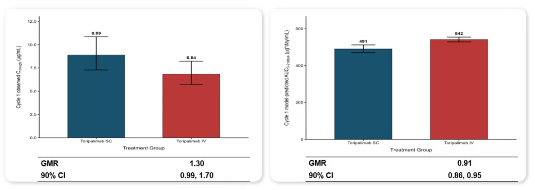 该研究为多中心、随机、开放的Ⅲ期临床试验,由邬麟牵头,共纳入来自中国72家中心的受试者。研究共入组396例既往未接受过系统性抗肿瘤治疗、无EGFR/ALK驱动基因突变的复发或转移性非鳞状NSCLC患者,按1:1随机分配接受每3周一次的JS001sc皮下注射(360mg)联合化疗,或JS001静脉输注(240mg)联合化疗。研究的共同主要终点为药物暴露量指标,包括第一周期结束时的实测谷浓度(Ctrough)以及通过群体药代动力学模型模拟的第一周期0-21天药时曲线下面积(AUC0-21d)。结果显示,两组第一周期Ctrough的几何均值比(GMR)为1.30(90%CI:0.99-1.70),AUC0-21d的GMR为0.91(90%CI:0.86-0.95),均达到预设的非劣效标准,证明特瑞普利单抗皮下注射液的药物暴露量非劣效于静脉注射液。