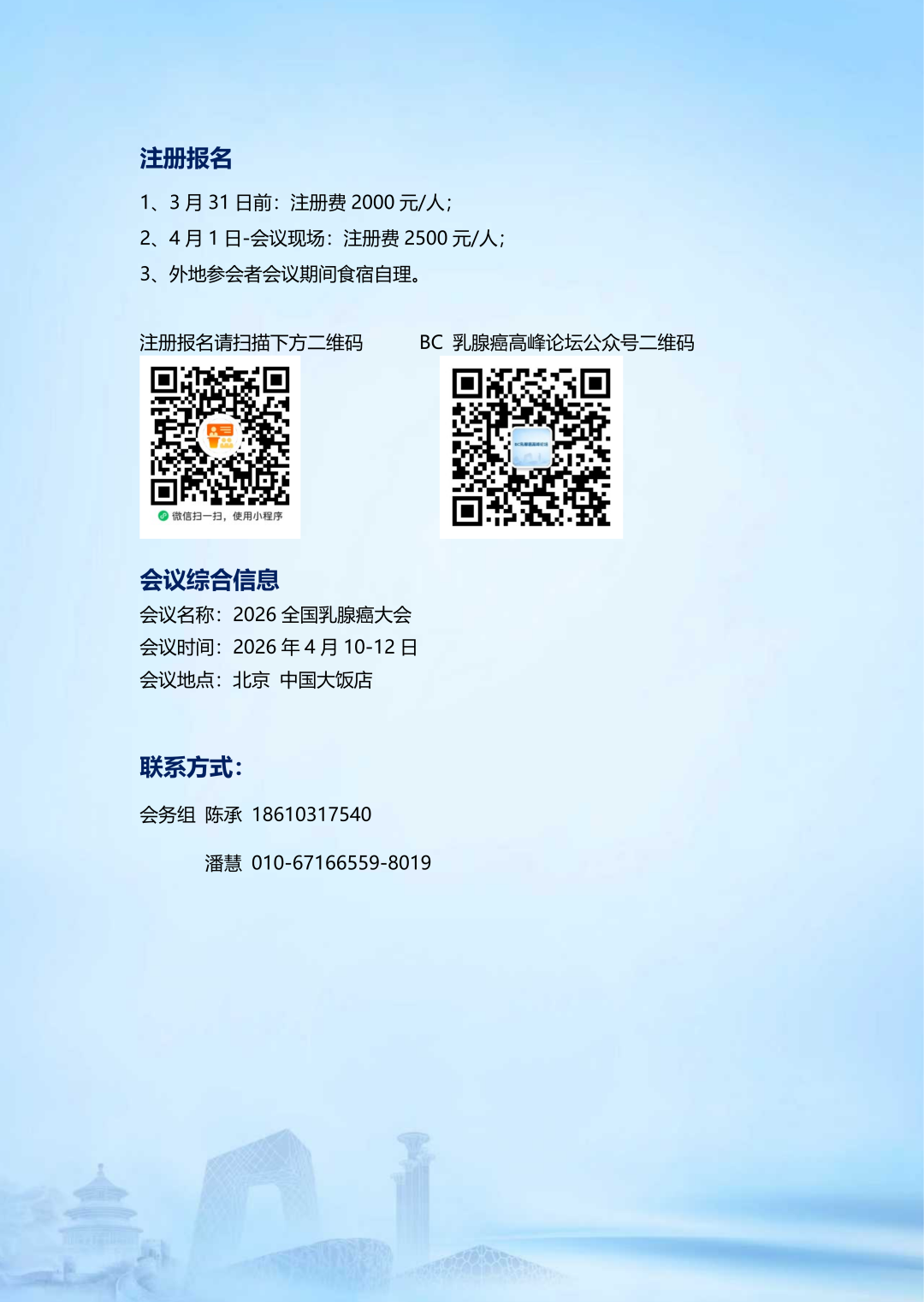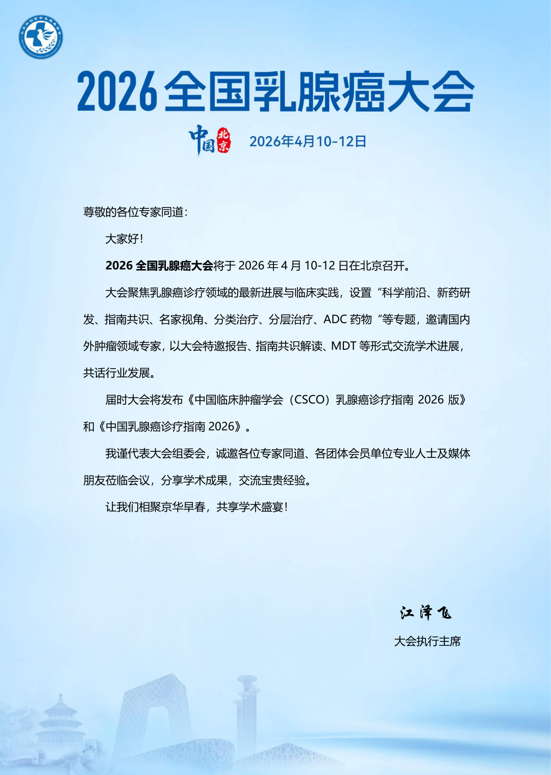 “2026全国乳腺癌大会”即将拉开帷幕。4月10 - 12日相聚早春京华,共赴学术盛宴!