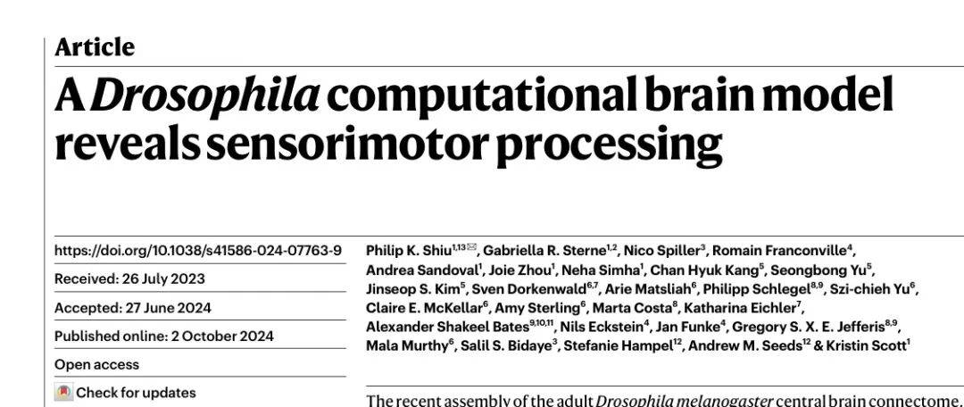 2024 年,Eon 高级科学家 Philip Shiu 及其合作者在《 Nature 》杂志发表了成年黑腹果蝇完整大脑的计算模型。该模型包含超过 12.5 万个神经元与 5000 万个突触连接,基于 FlyWire 神经连接组与机器学习对神经递质类型的预测构建而成。该模型对运动行为的预测准确率达到 95%。但它是无躯体的:只有大脑、没有身体;只有神经激活、没有物理交互;只有运动输出、无处执行。