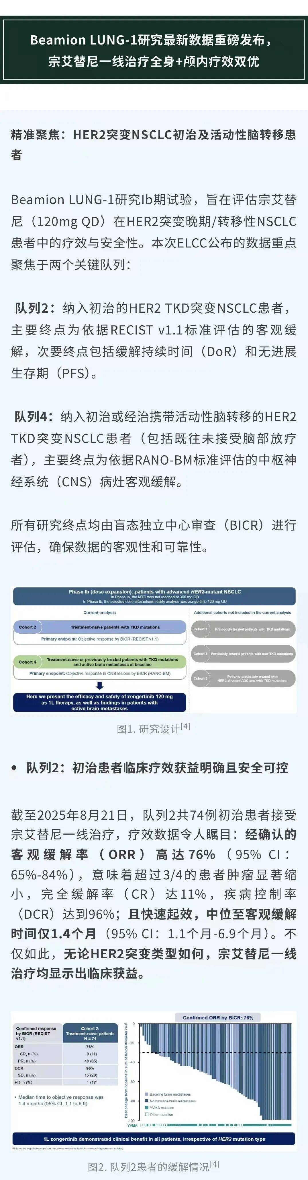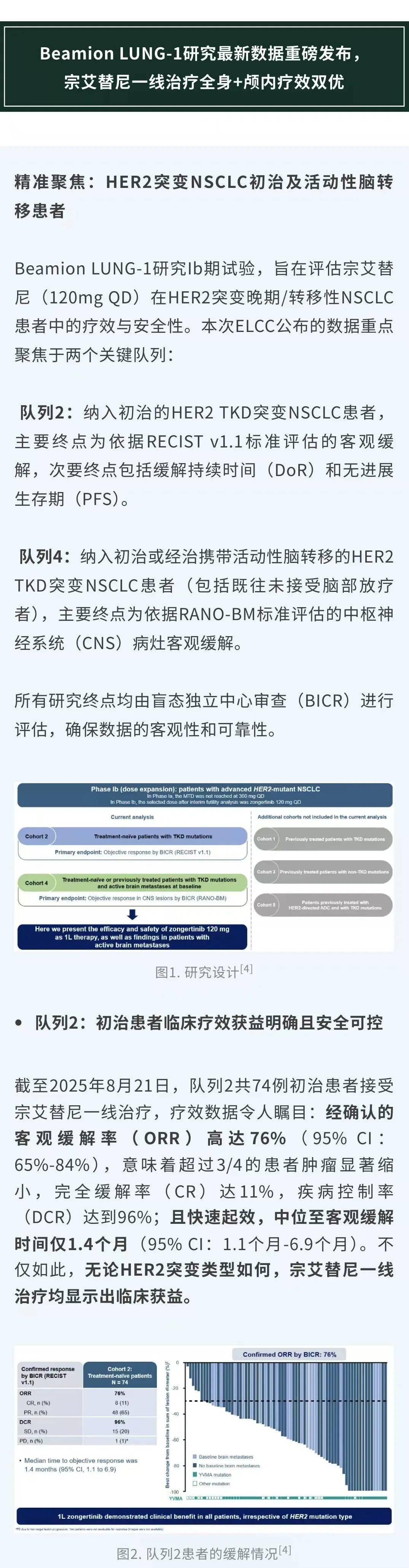 近日,2026年欧洲肺癌大会(ELCC)于丹麦哥本哈根盛大召开,作为全球肺癌领域的顶级学术盛会,本次大会公布了多项改写临床实践的重磅研究成果。其中,Beamion LUNG-1研究中宗艾替尼治疗HER2突变非小细胞肺癌(NSCLC)初治患者(队列2)和伴活动性脑转移患者(队列4)的最新结果成功入选Mini Oral session,成为本次大会的焦点之一。HER2突变NSCLC作为一类侵袭性强、预后差的亚型,长期面临一线治疗选择有限、脑转移患者治疗陷入困境的临床难题 [1-3] ,而宗艾替尼此次公布的最新数据,不仅进一步验证了其在初治患者中具有临床意义的疗效,更在活动性脑转移这一“难治人群”中展现出亮眼的颅内抗肿瘤活性 [4] ,为该领域的精准治疗带来新的突破。值此盛会之际,特邀 广东省人民医院吴一龙教授, 对该研究的核心数据及临床意义进行深度解读。