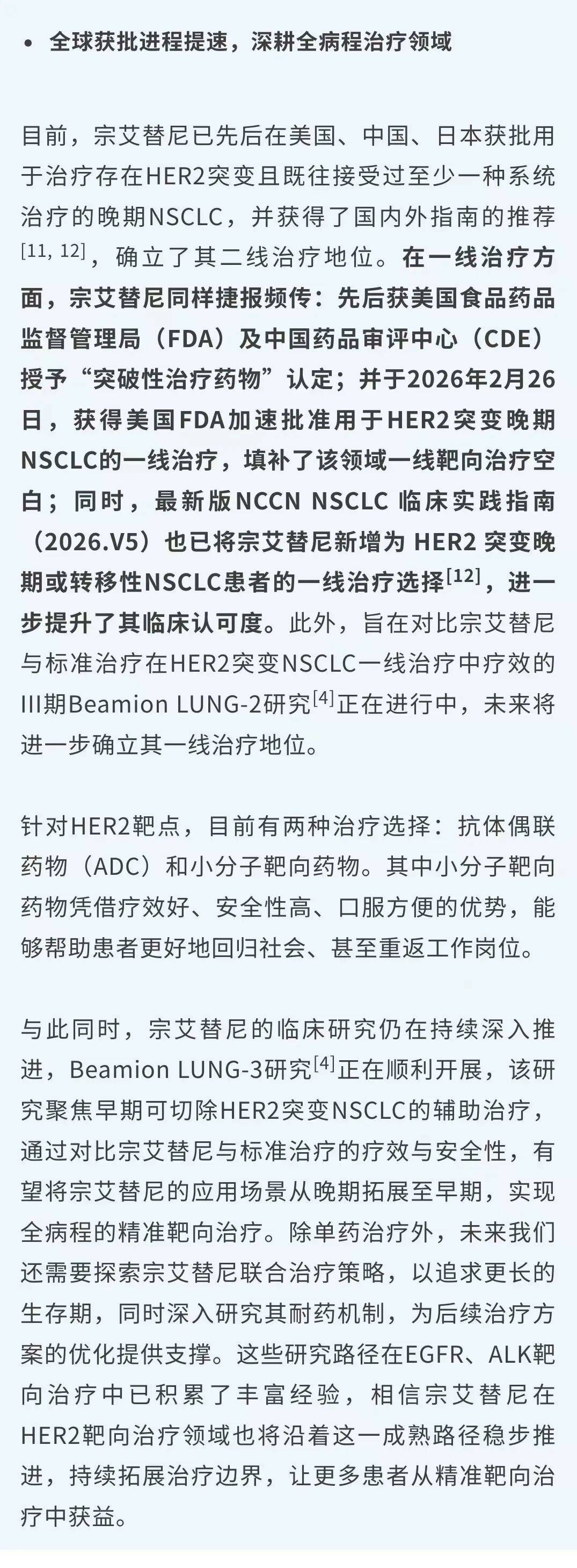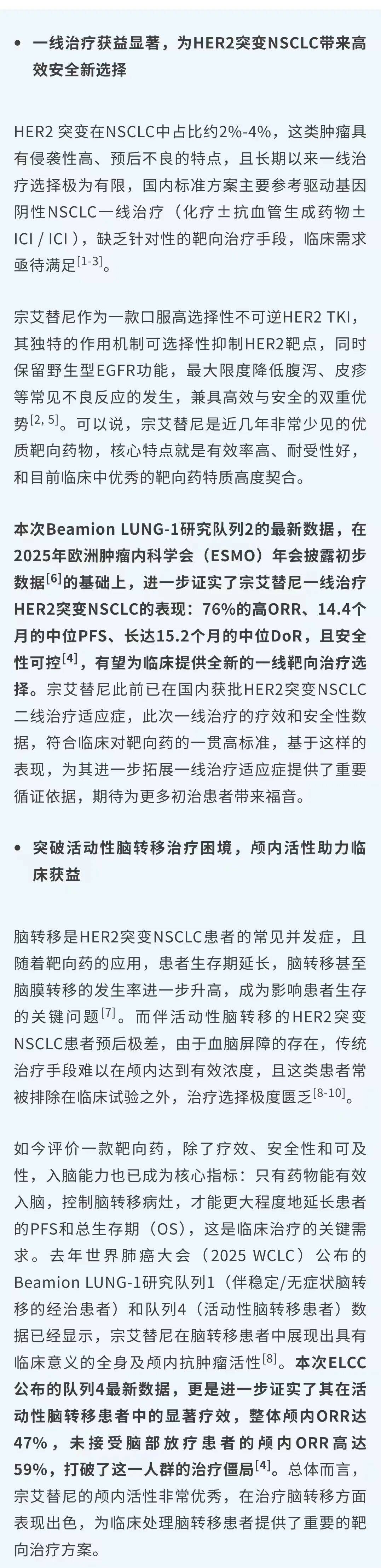 [4]John V. Heymach, Noboru Yamamoto, Nicolas Girard, et al. Zongertinib in Treatment-Naïve Patients With HER2-mutant NSCLC, Including Those With Active Brain Metastases: Beamion LUNG-1. 2026 ELCC. 6MO .