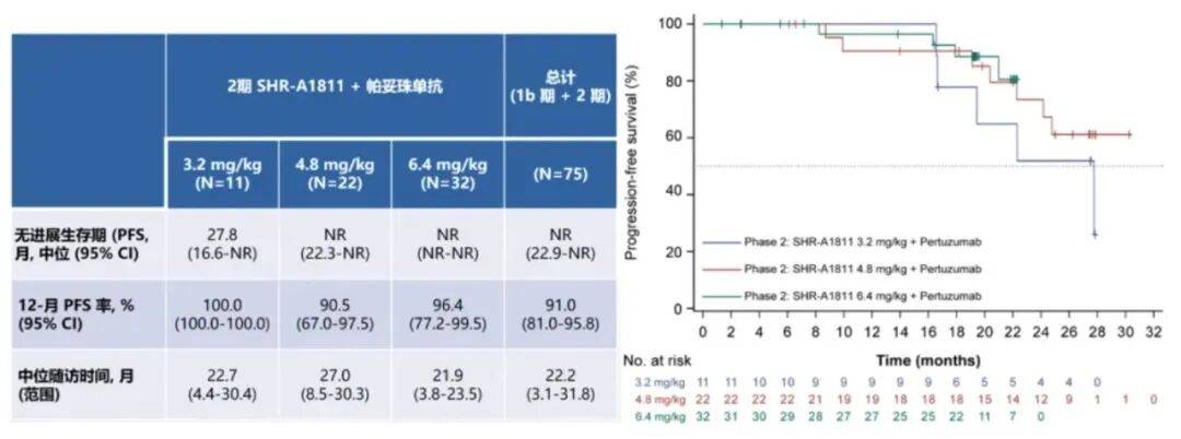 • 3.2 mg/kg 瑞康曲妥珠单抗+帕妥珠单抗的 ORR 为 63.6%(95% CI:30.8-89.1) ; mPFS 为 27.8 个月 (95% CI:16.6-NR) ; 12 个月 PFS 率是 100.0% (95% CI:100.0-100.0) 。