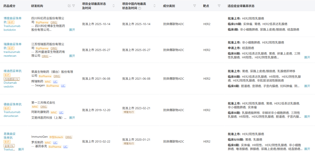 HER2 当属于肿瘤领域最热门的靶点之一。 据 Insight 数据库统计 , 当前全球已有超40个临床阶段 HER2 ADC 项目 (排除非积极)在研,其中在国内获批上市的已有5款之多,包括罗氏恩美曲妥珠单抗 、 第一三共/阿斯利康德曲妥珠单抗 、 荣昌生物的维迪西妥单抗、科伦博泰的博度曲妥珠单抗以及恒瑞医药的瑞康曲妥珠单抗。