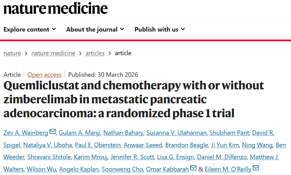 [1] Wainberg, Z.A., Manji, G.A., Bahary, N. et al. Quemliclustat and chemotherapy with or without zimberelimab in metastatic pancreatic adenocarcinoma: a randomized phase 1 trial. Nat Med (2026). https://doi.org/10.1038/s41591-026-04283-z